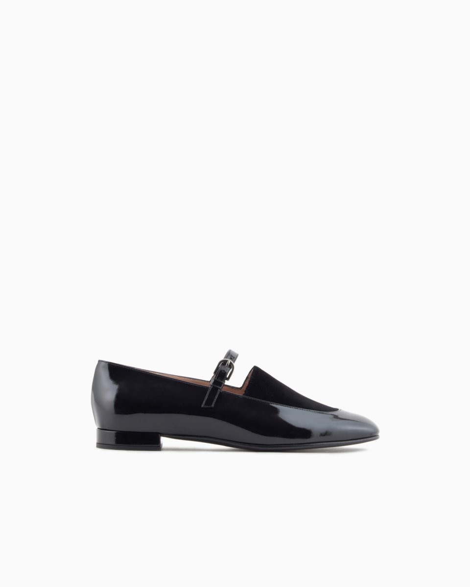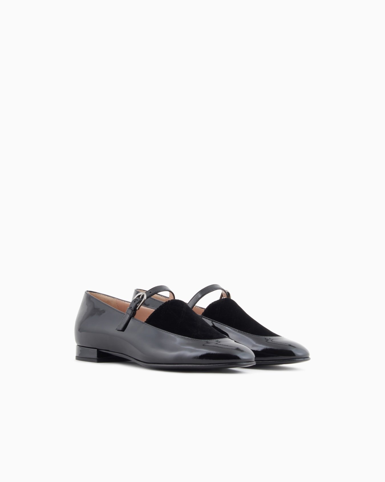 Patent leather Mary Jane ballerinas with a strap embellished with velvet inserts with a high-frequency quilted motif. A new footwear item designed to accompany outfits from the morning to evening drinks.