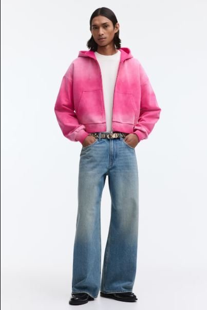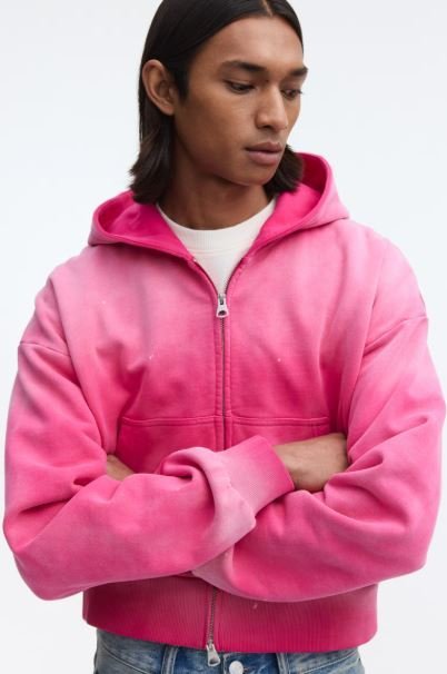 Oversized, boxy, hooded sweatshirt jacket in heavyweight fabric with an extra-loose silhouette and soft, brushed inside. Two-way zipper at front, front pockets, dropped shoulders, and long sleeves. Ribbing at cuffs and hem.