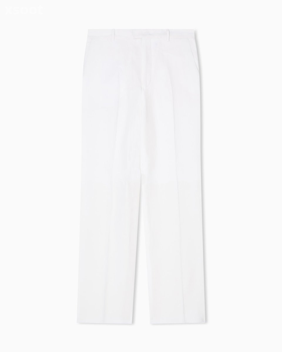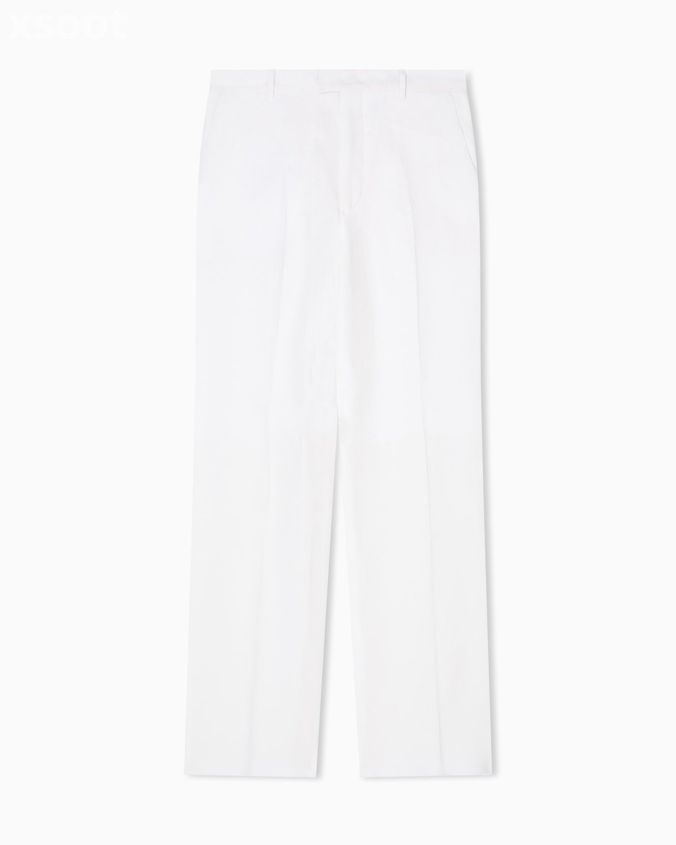 Linear-cut trousers with belt loops at the waist. The essential design combines with the lightness and freshness of pure linen, whose luxury and sheen enhance the classic lines of this style, automatically making it a must-have for the sunny season.