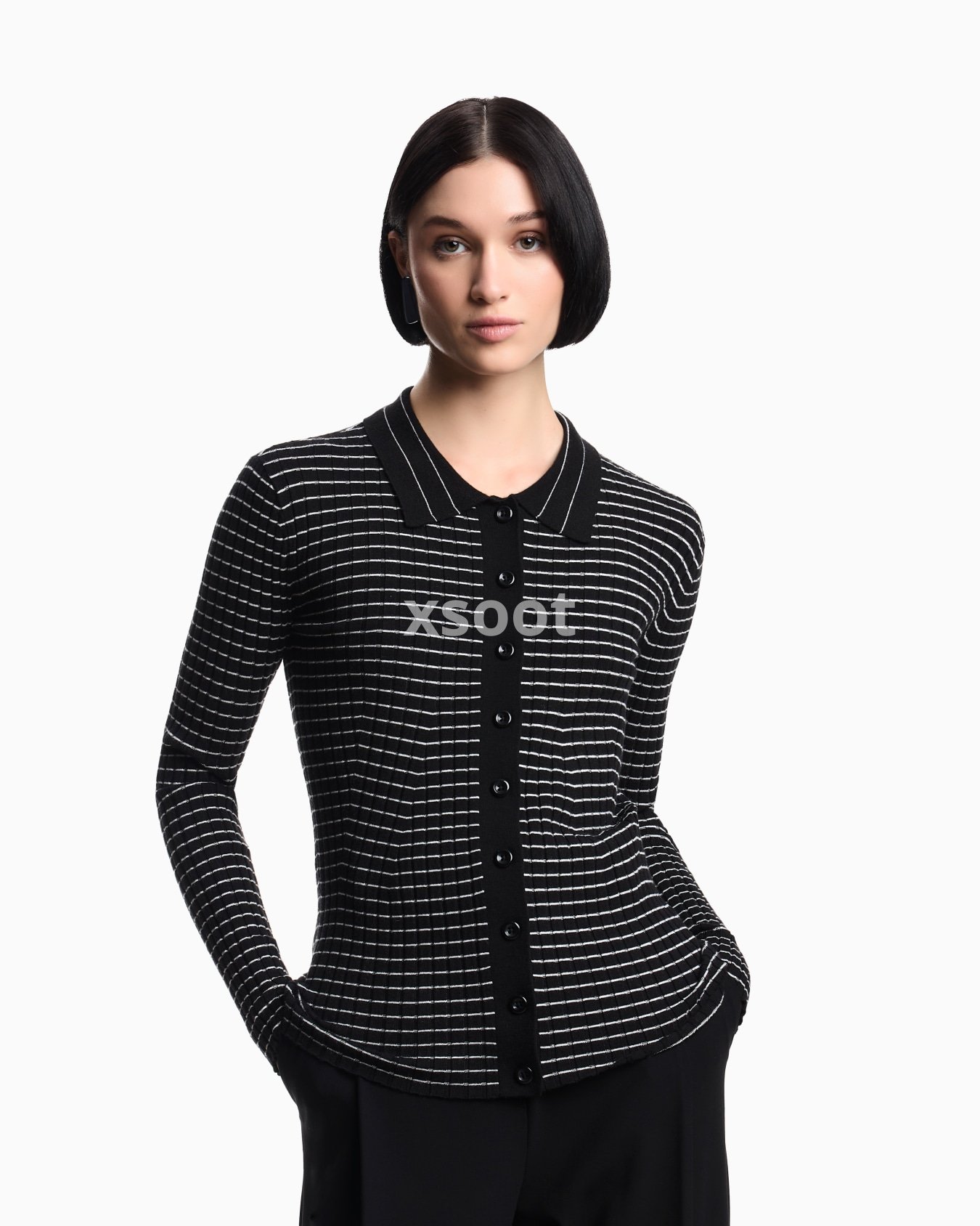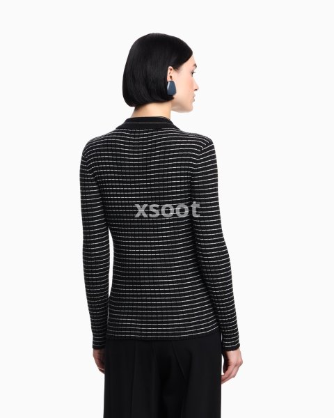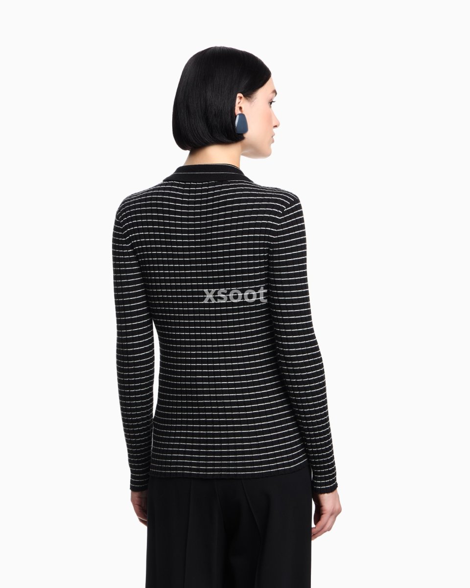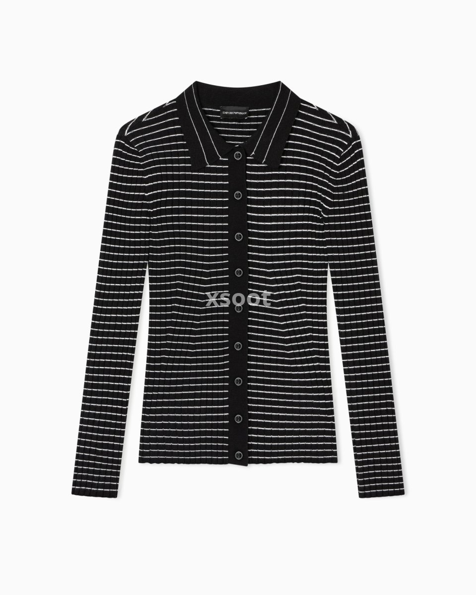 Cardigan with a polo collar and front button placket, made of a viscose blend in a rib-knit. The horizontal striped pattern creates a check effect that distinguishes the style.