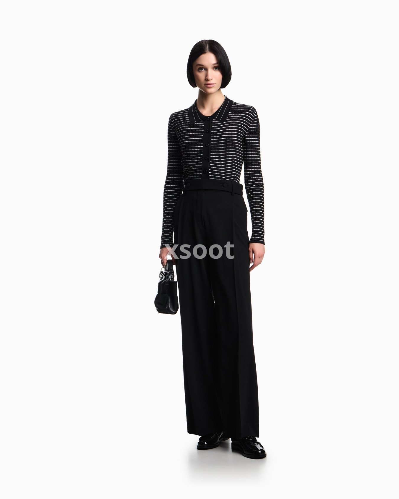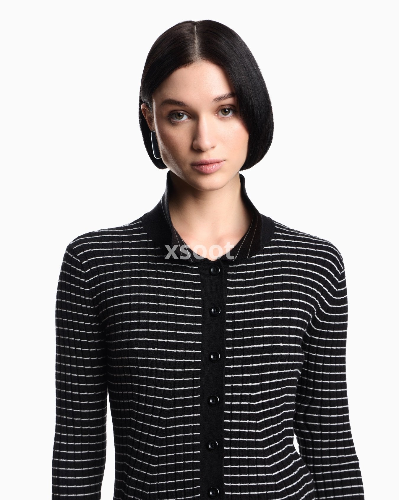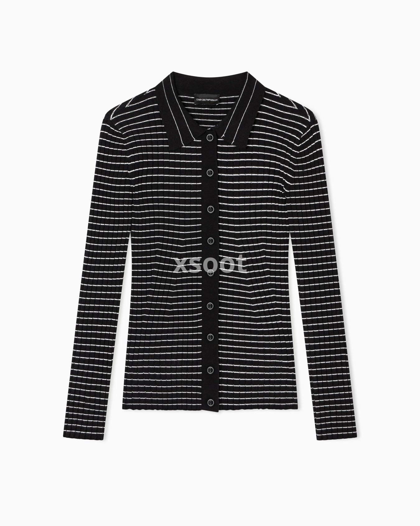 Cardigan with a polo collar and front button placket, made of a viscose blend in a rib-knit. The horizontal striped pattern creates a check effect that distinguishes the style.