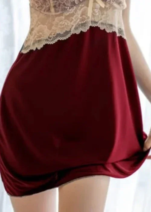 Features: Soft, breathable satin fabric for gentle comfort Intricate floral lace bust panel for a graceful look Adjustable shoulder straps for a flexible fit Satin bow detail for a delicate finish Mid-thigh length for classic coverage