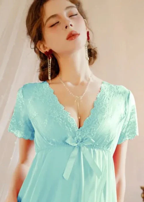 Elevate your nightwear with Lunelle Grace, a dreamy lace-trimmed nightdress designed for timeless femininity. Featuring a soft V-neckline, fluttery lace sleeves, and a flowing hemline, this piece flatters your silhouette with gentle charm. The satin bow detail at the bust adds a delicate touch to this romantic design — perfect for evenings when you want to feel both elegant and relaxed.
