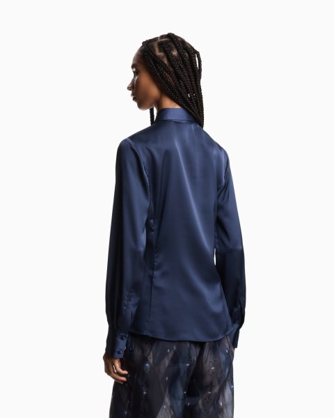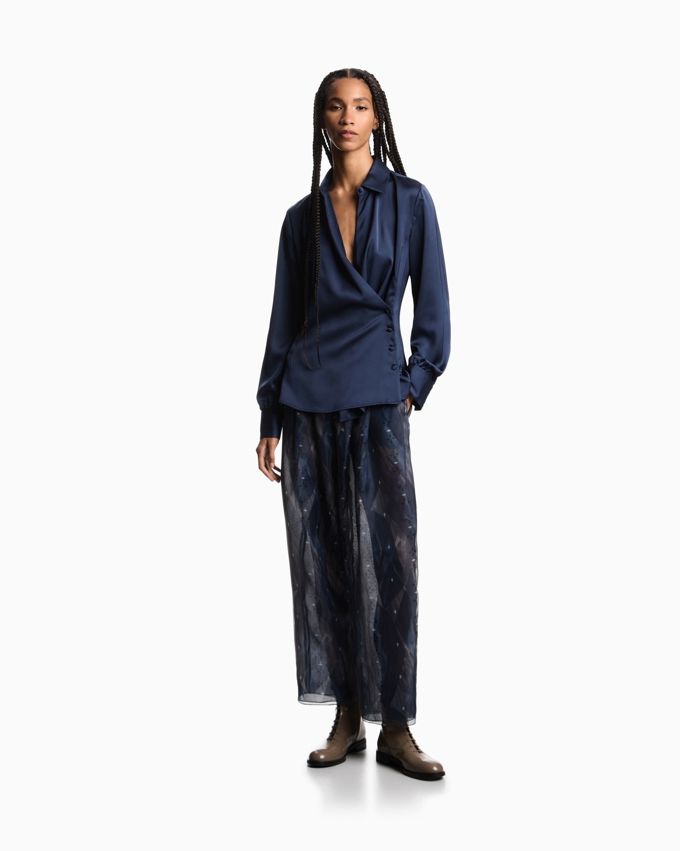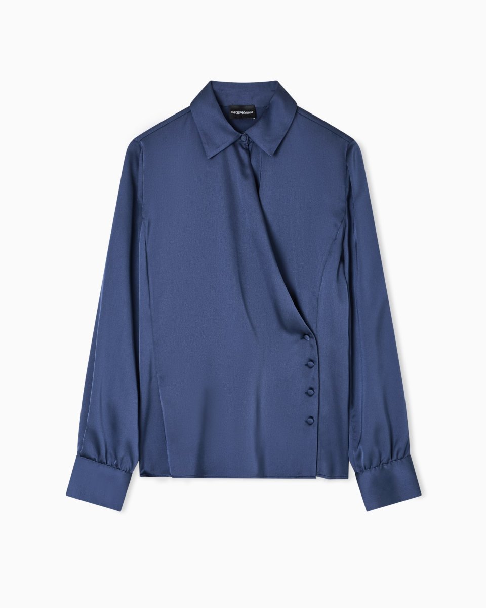 Blouse with a classic collar made of satin crêpe, a fabric that adds a natural sheen to the garment. The reverse side of the piece has a crêpe finish, while the exterior remains lustrous and bright. The style is distinguished by a partial wrap closure with buttons on the left hip. A feminine piece suitable for day&night occasions.
