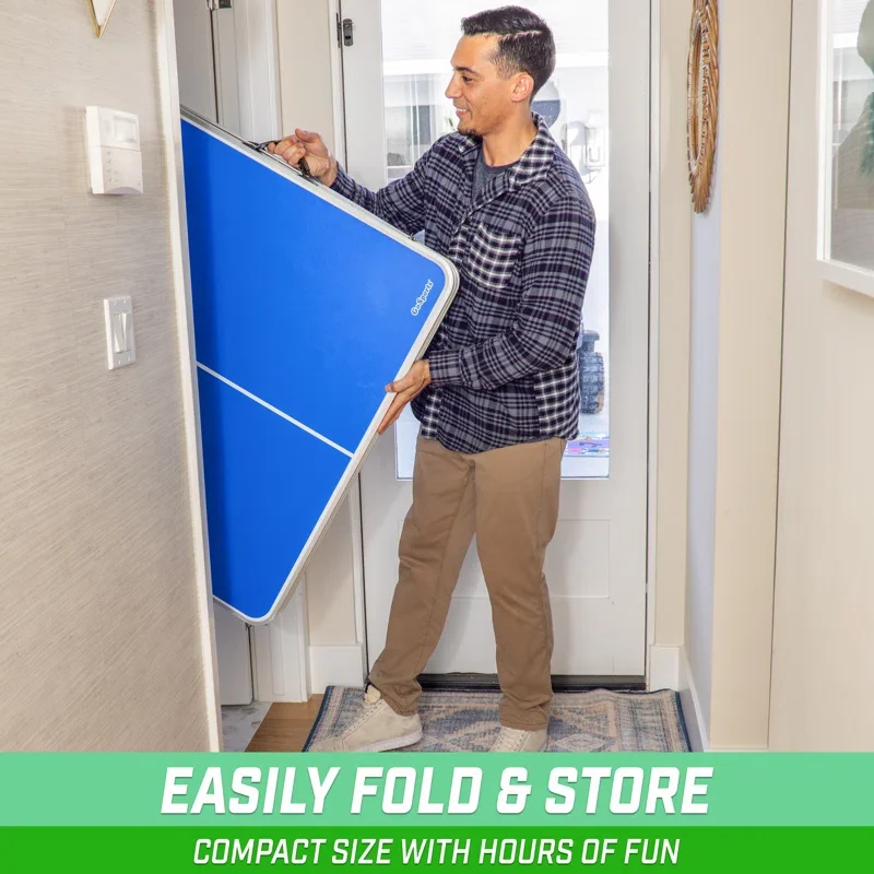 - NO ASSEMBLY REQUIRED: Ready to play out of the box, instantly fold out for play and fold up in seconds for storage; Lightweight and easy to carry by one adult using built-in handles; Folded table measures 3 x 3 ft x 3 inches
