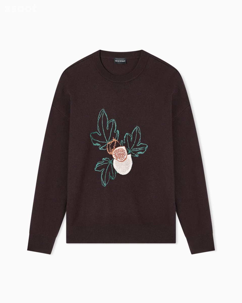 Plain-knit virgin wool crew-neck jumper with dropped shoulders. The garment is embellished with an oversized embroidery featuring figs and foliage, a still life that elegantly elevates it, making it suitable for casual and more formal moments.